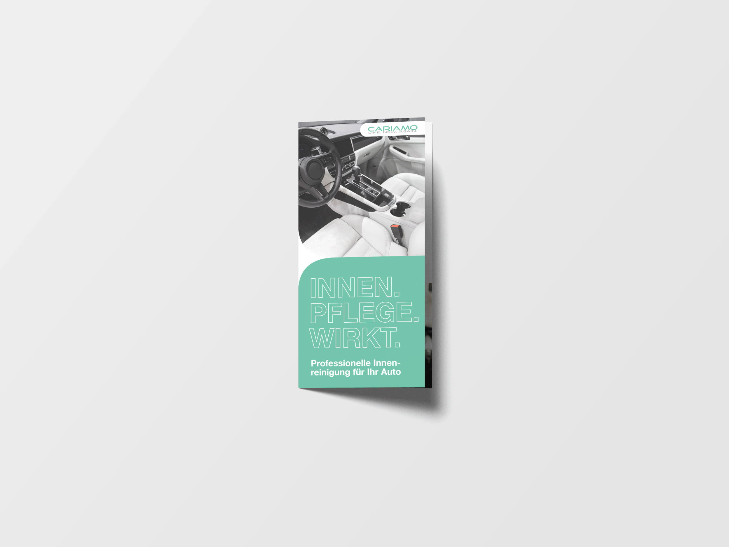 Eventually, the CEO wanted to advertise CARIAMO through leaflets, too. With the proposed copy text, I’ve done research on suitable formats and created the layout. In it, the brand’s design palette shines through again—with color accents in turquoise and modern illustrative elements, for example. High-quality stock photos visualize the service’s promise and value while suiting the industry and target group and supplementing the modern clear look.