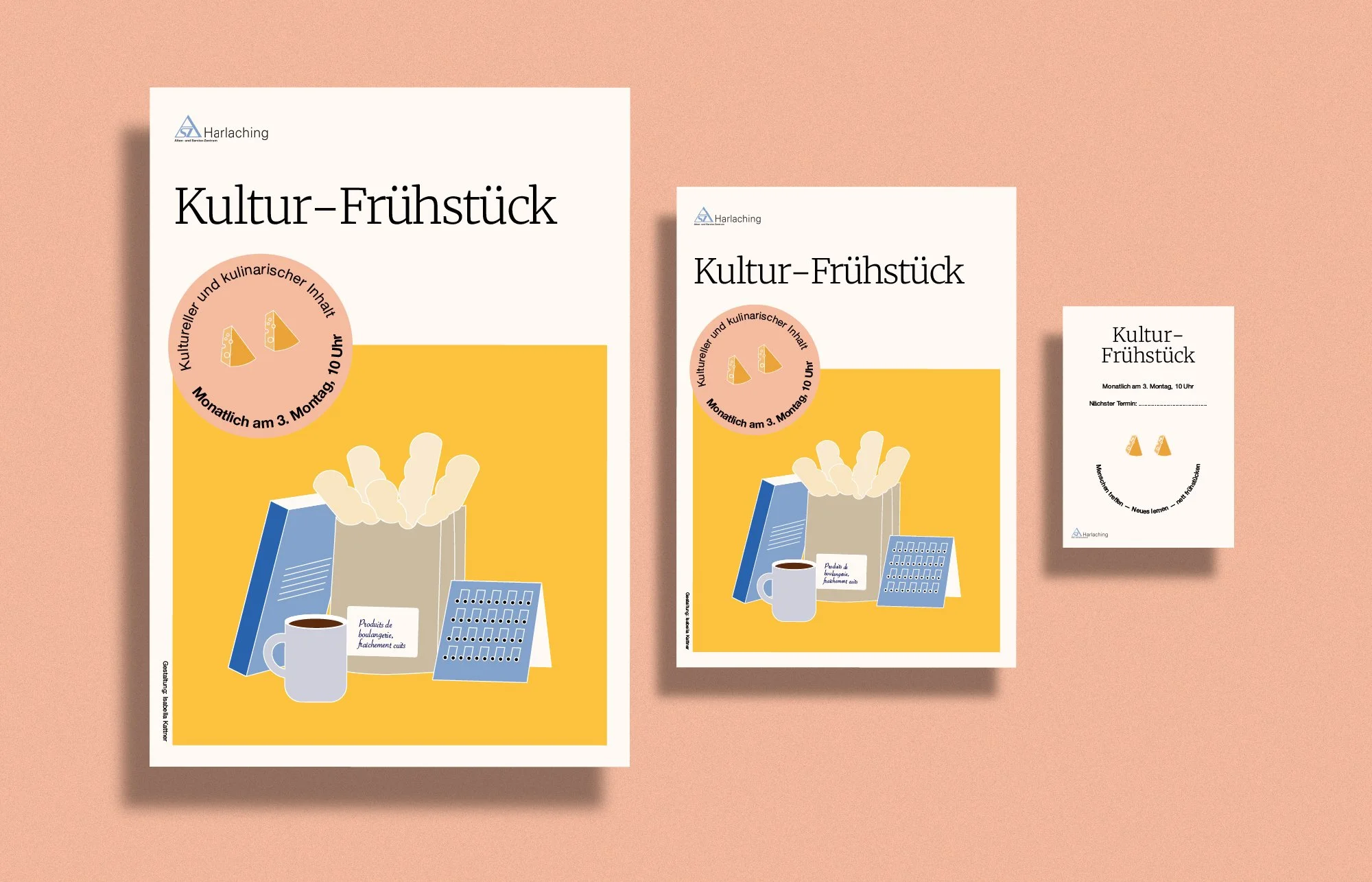 For a service center for the elderly in Munich (Alten- und Service-Zentrum—ASZ), I created a poster and a suiting handout that they can give away to their visitors. The occasion is their Cultural Breakfast (Kulturfrühstück): an event that takes place once a month, offering a program for the elderly in Munich where they come together to have breakfast and listen to a lecture about culture, literature, and other topics.